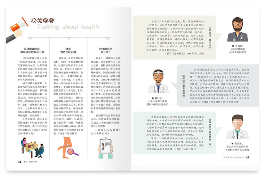 《愛你》“紅版”刊頭為紅色,內容涉及身心健康、養心益壽、文史博覽、婚姻家庭、生活百科、美顏美體等各方面的知識,集故事性、藝術性和趣味性于一體,是“幸福家庭的健康讀本”?!稅勰恪罚ㄐ撵`讀本)“藍版”刊頭為藍色,一直踐行“大健康”的辦刊理念,致力于做“優雅人士的心靈讀本”。