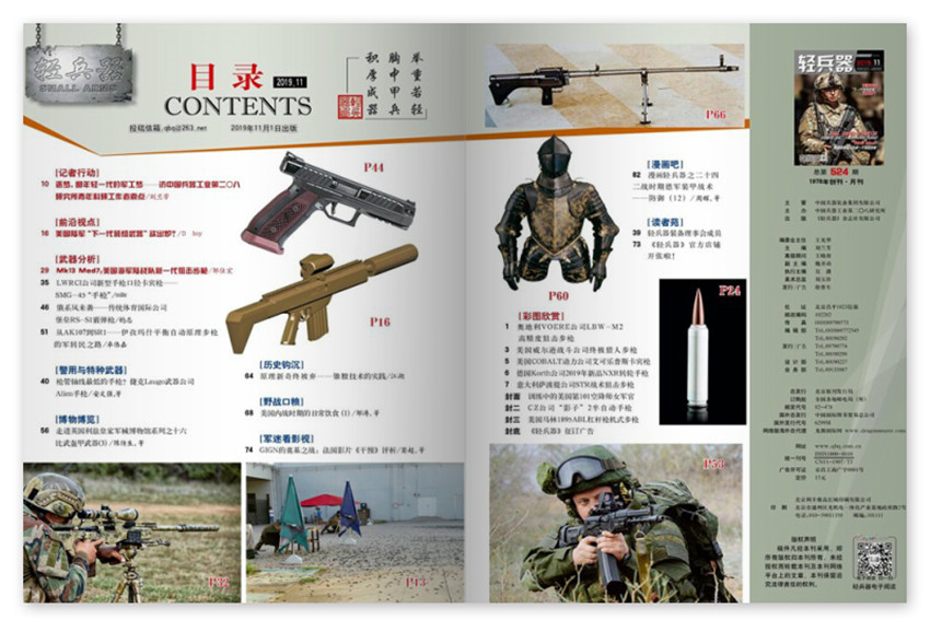 《輕兵器》雜志,(月刊),是面向全國發行的科技軍事類期刊,雜志擁有獨到的思維與敏銳的眼光,使得雜志成為眾多國際大品牌客戶重視的核心媒體之一。介紹在槍展及防務展上的展品,很多都是平常難得一見的“稀有物種”。討論輕武器的發展方向,介紹歷史上著名的槍械及彈藥,介紹國產輕兵器。